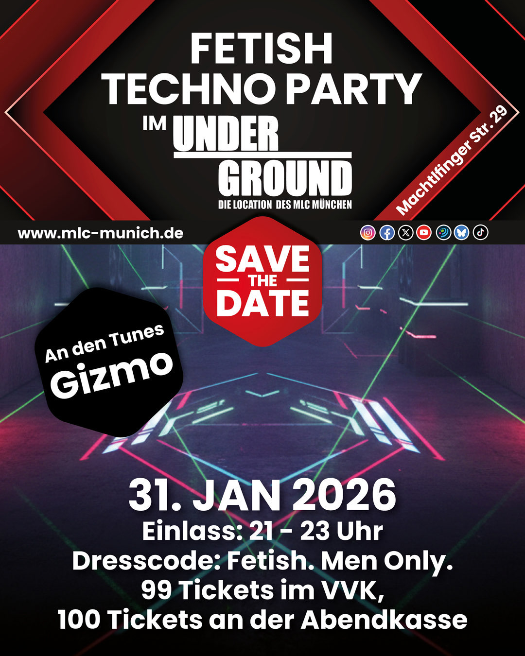 Outfit aus Rubber, Neopren oder PVC. Dresscode: https://www.mlc-munich.de/web/der-mlc/dresscode/ Einlass von 21:00 Uhr bis 23:00 Uhr