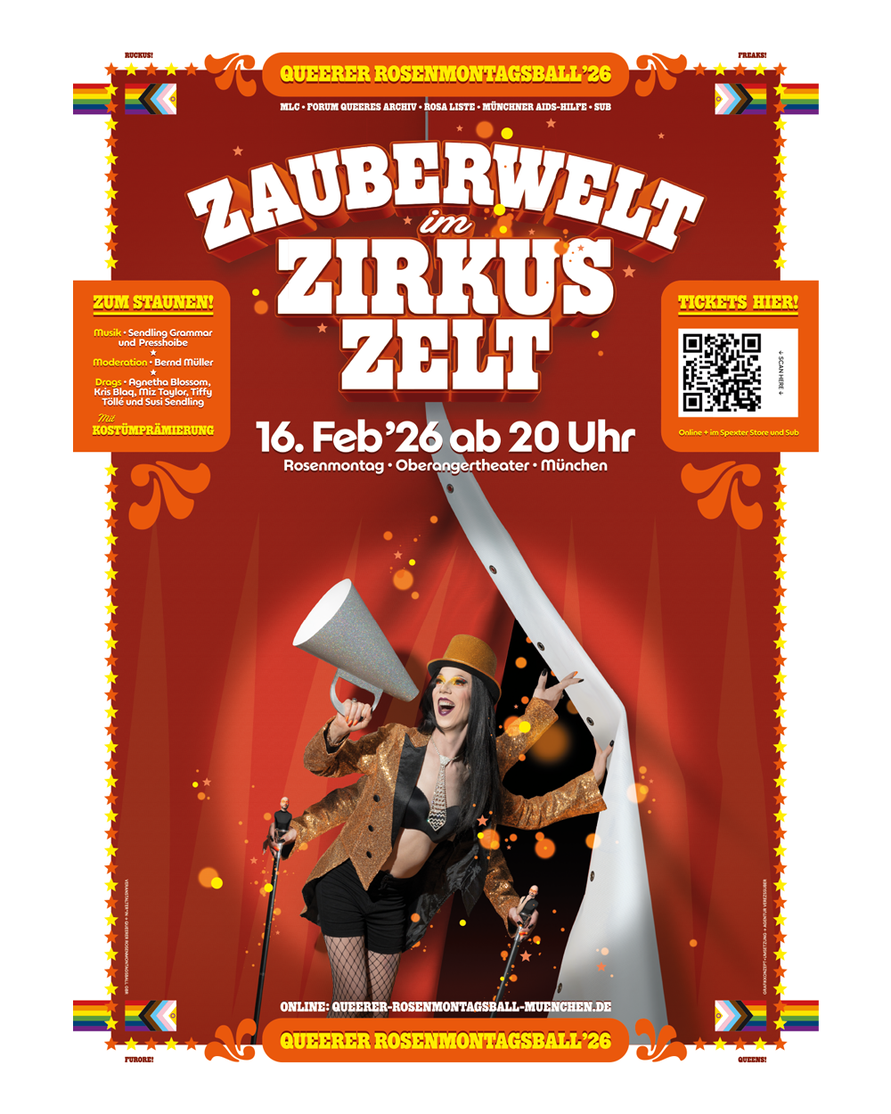 Motto: Zauberwelt im Zirkuszelt Live DJs Sendling Grammar und Presshoibe Moderation: Bernd Müller Drags: Agnetha Blossom, Kris Blaq, Miz Taylor, Tiffy Tölle, Susi Sendling Mit Kostümprämierung Tickets im VVK: Ticketshop